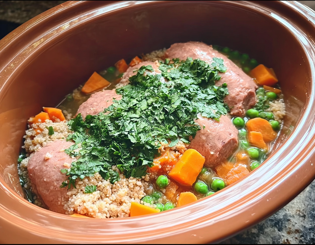 - Add the ground turkey, frozen peas and carrots, frozen sweet potatoes, frozen spinach, brown rice, and water to the slow cooker.
