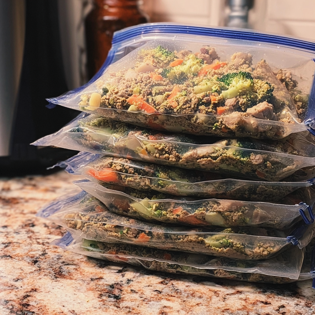 This is the exact recipe I use. I usually set aside a Sunday afternoon, and in return I get a freezer stocked with healthy meals that keep Benji balanced, energetic, and thriving.