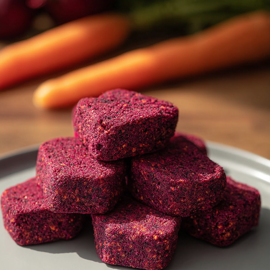 Cooked beetroot gives these biscuits a deep, gorgeous pink that artificial dyes just can’t replicate. Combined with carrots, the result is a gourmet-looking treat made entirely from vegetables no boring brown biscuits here!
